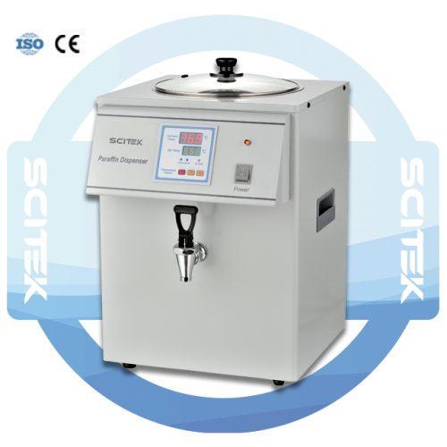 This paraffin dispenser holds approximately 10 liters of melted paraffin wax, providing a high capacity of melted wax for high throughput histology laboratories and embedding centers.