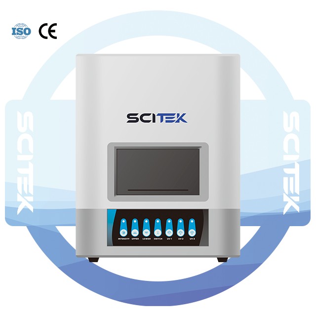 - Control panel: contains 7 control buttons, including light intensity, upper light source, lower light source, switch, UV-01, UV-02, and UV-03. The upper and lower light sources can be turned on and off separately; It can also be opened and closed simultaneously; The light intensity can be adjusted in two levels: high and low for the upper light source, and high and low for the lower light source.