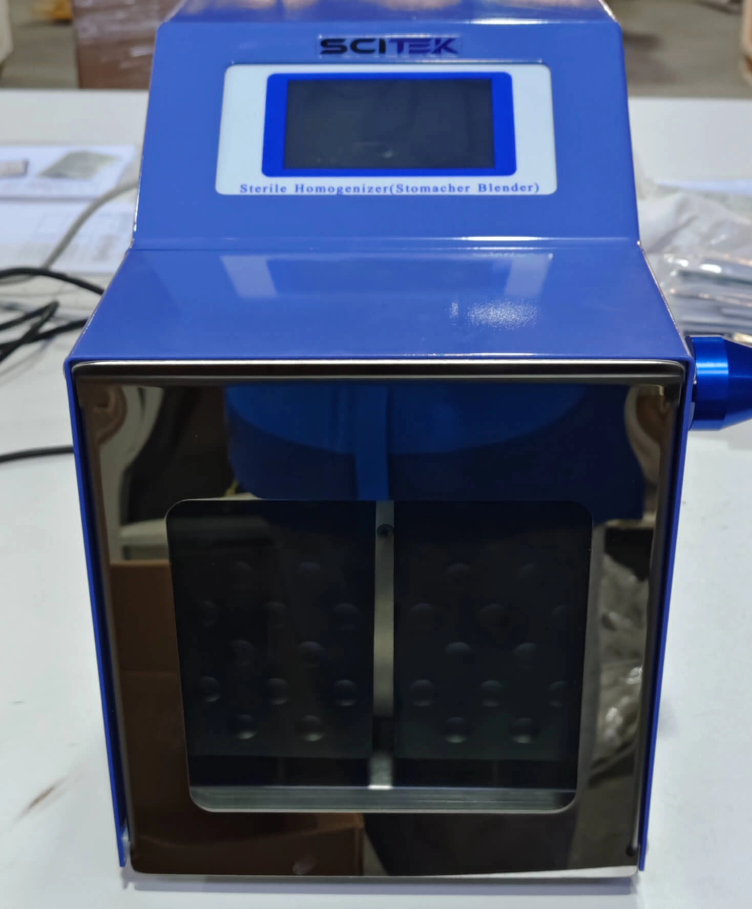 The beating type aseptic homogenizer features a stainless steel body with a transparent door, allowing users to monitor the homogenization process. The sterile, sealed homogenization chamber accommodates various sample bags, preventing cross-contamination.