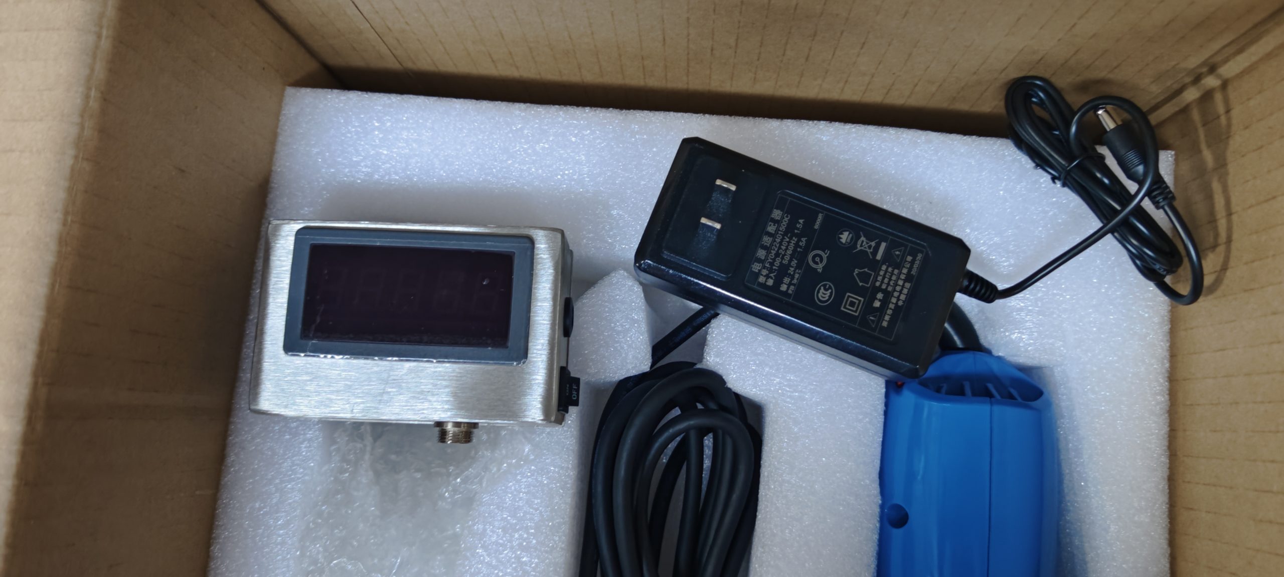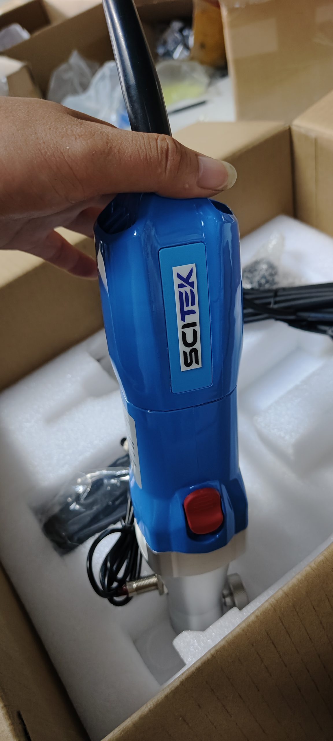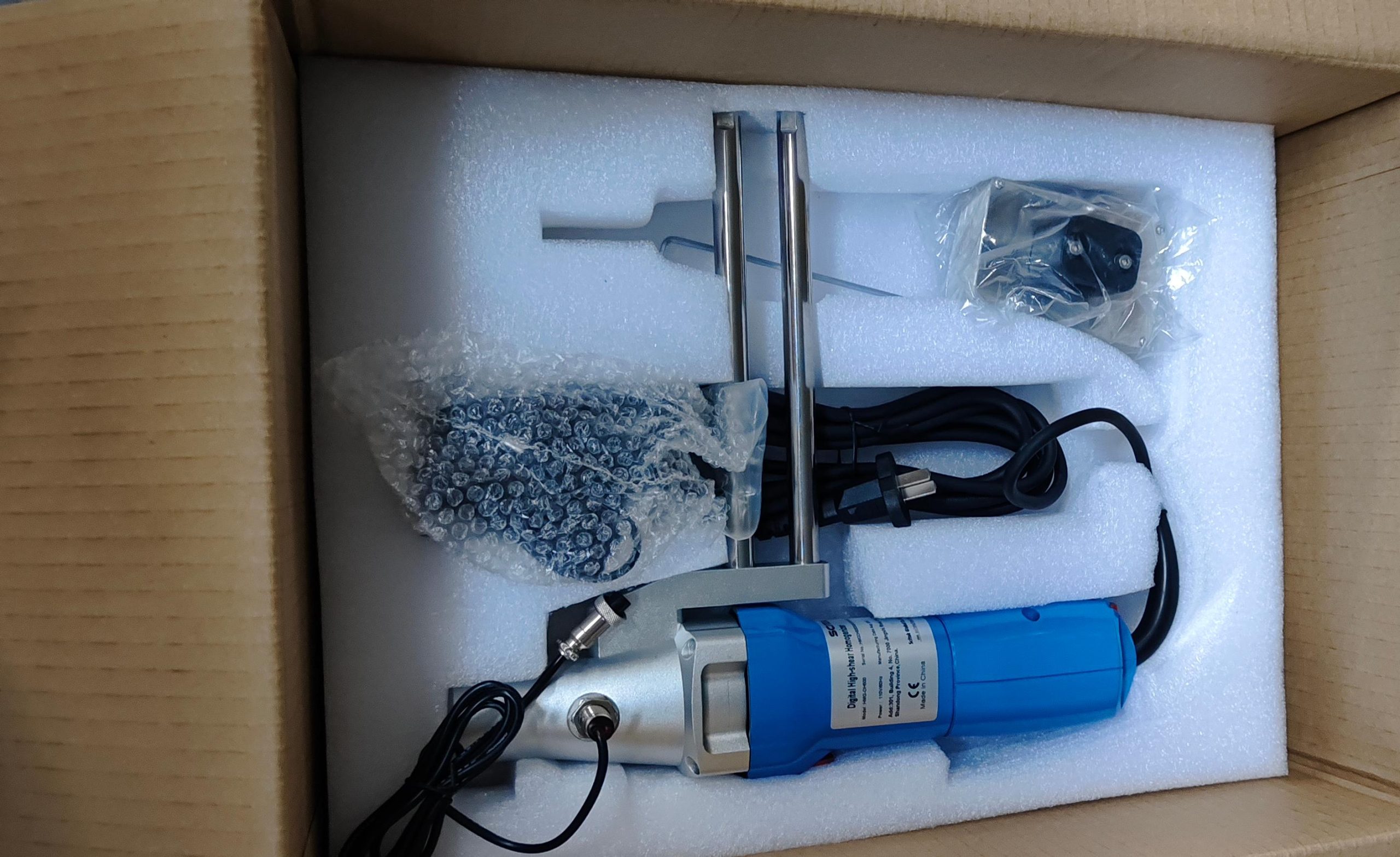 View of the complete set, including the main unit, homogenizing head, fixing bracket and other auxiliary accessories. All components are neatly arranged in foam packaging to ensure safety during transportation.