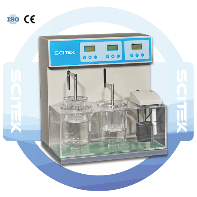 The disintegration time limit tester’s test rack and glass beaker are fully equipped and compatible with multiple sample positions.