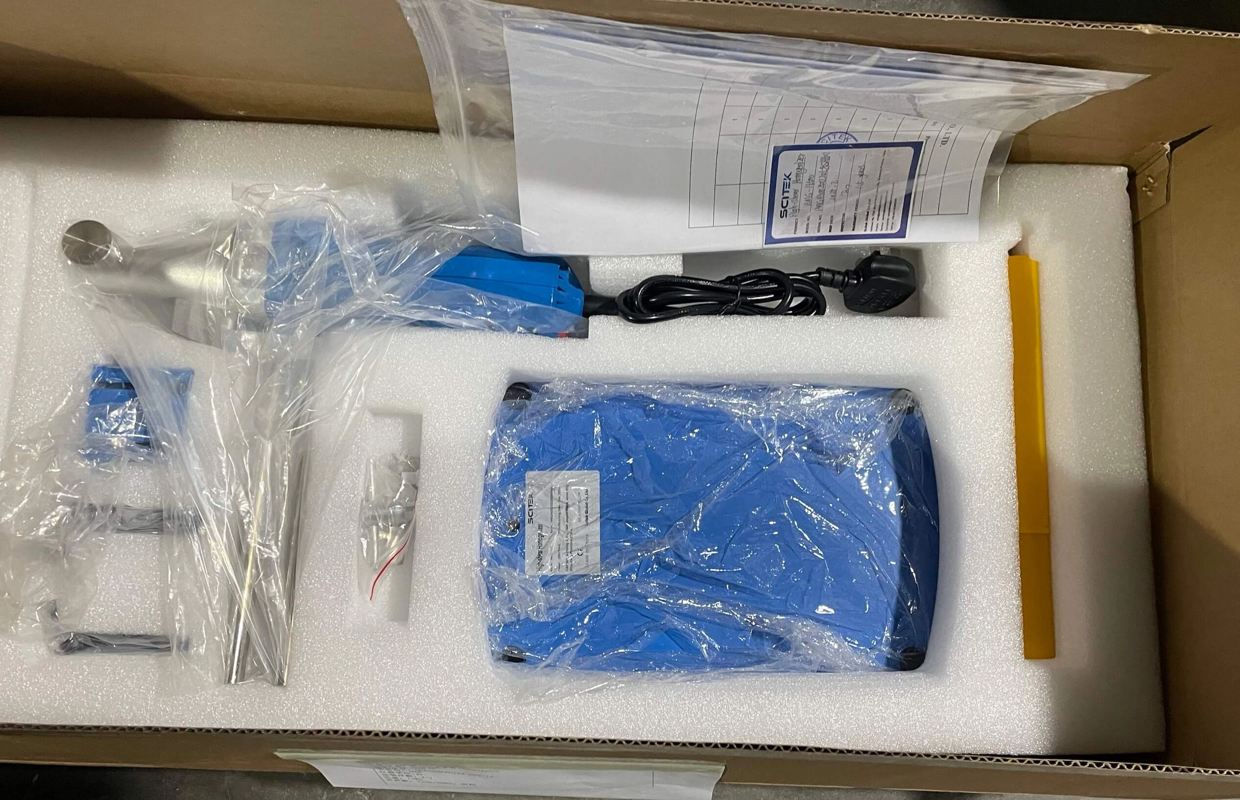 The packaging of the High Shear Homogenizer is designed for secure and safe transport. The unit is carefully placed inside a sturdy, protective box with foam padding to prevent any damage during shipping. The packaging includes clear labeling, making it easy to identify the product and its specifications. Additionally, the box is designed for easy handling, ensuring that the homogenizer arrives in perfect condition, ready for installation and use. The protective materials also ensure that the device remains secure throughout transit.